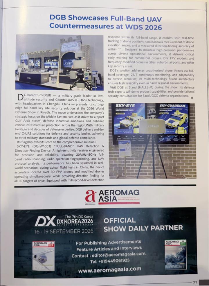 Prestigious international defense media like ARABIAN DEFENCE and aeromagasia.com interviewed DGB's technical experts. The experts shared insights on industry - relevant topics such as low-altitude airspace security, comprehensive UAV threat countermeasures, and electromagnetic space security. DGB's technological solutions, characterized by full-band coverage, 24/7 real-time monitoring, and all-terrain adaptability, along with its localized service philosophy, were widely reported and endorsed. This has enabled the global market to better understand the strength and international adaptability of China's low-altitude security technology.