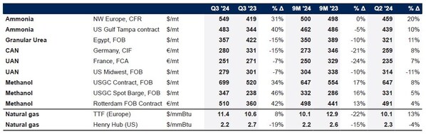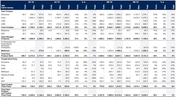 Own-produced sales were 499 thousand tonnes during the third quarter of 2024,representing a 37% increase over the same period last year and a 14% decline quarter-on-quarter. The year-on-year increase reflects higher ammonia and nitrate volumes in the period,as well as an increase in sales of premium industrial nitrogen products,melamine and diesel-exhaust fluid (DEF). Whilst benchmark prices for nitrates were lower in Q3 2024 compared to Q3 2023,they showed a sequential improvement quarter-on-quarter.