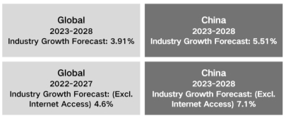 Figure: Industry growth forecasts for the global and Chinese media and entertainment markets. Data from PwC’s Global Entertainment & Media Outlook.